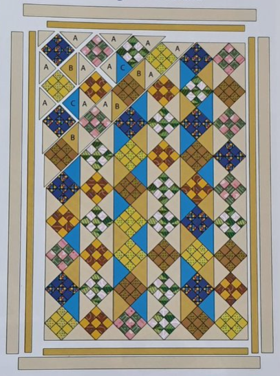 1. Monte a colcha, seguindo o desenho de montagem, comos nine-patches e os triângulos A, B e C.​