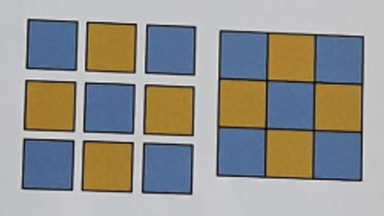 2 tecidos contrastantes (1 liso e 1 estampado). Faça 54 blocos. Reserve.​